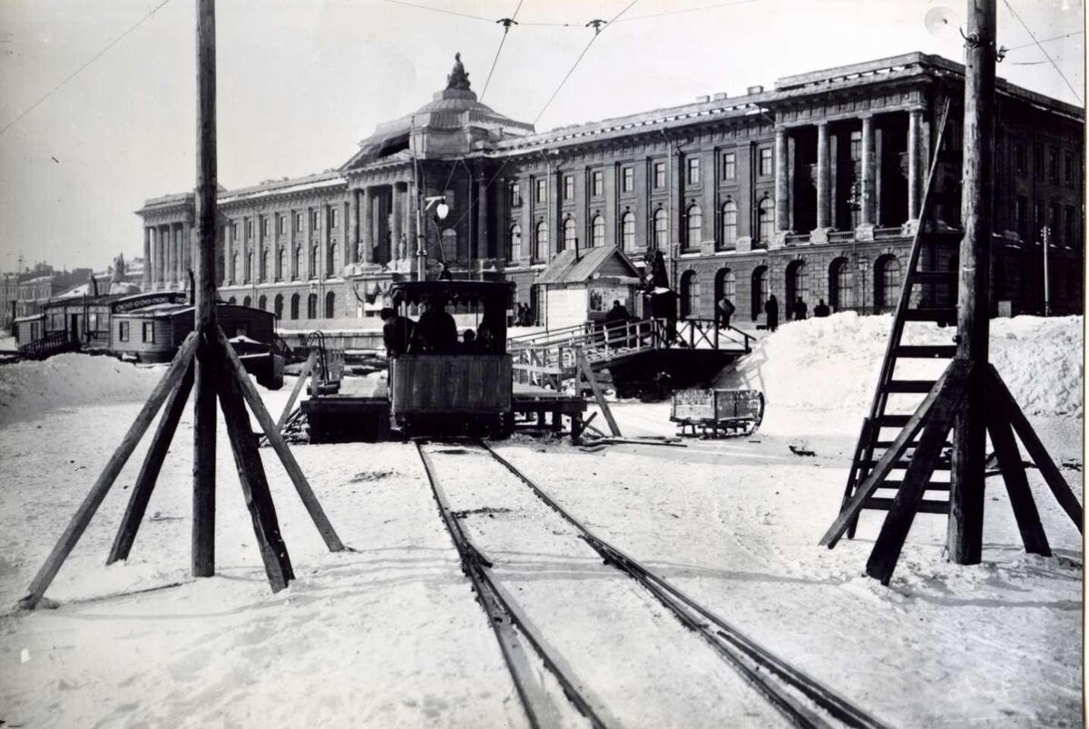 К январю 1895 года в Петербурге наконец всё было готово к запуску трамвая на электрической тяге, правда в путь он отправился не по земле, а по льду.