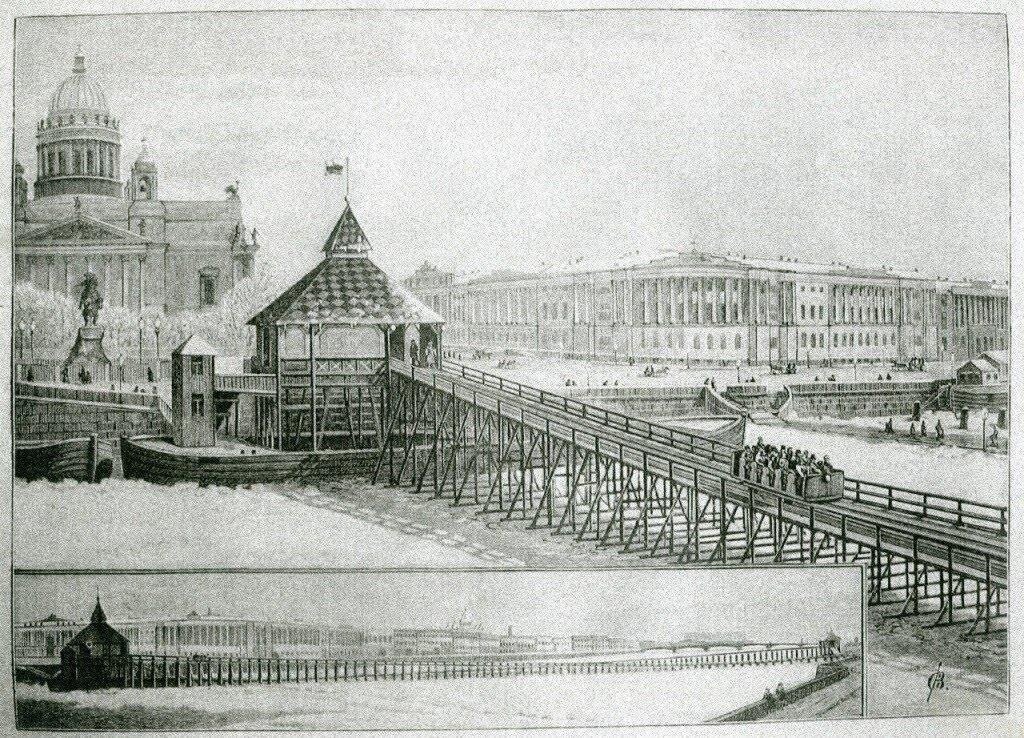А вот тут нашла интересную статью, как начиналось трамвайное сообщение в Питере. Конки не пускали в город новомодные устройства. И трамвай начался с ледового трамвая. Да, рельсы зимой прокладывали по льду рек. И не пересекаются с маршрутами конок (сами по своим рельсам).